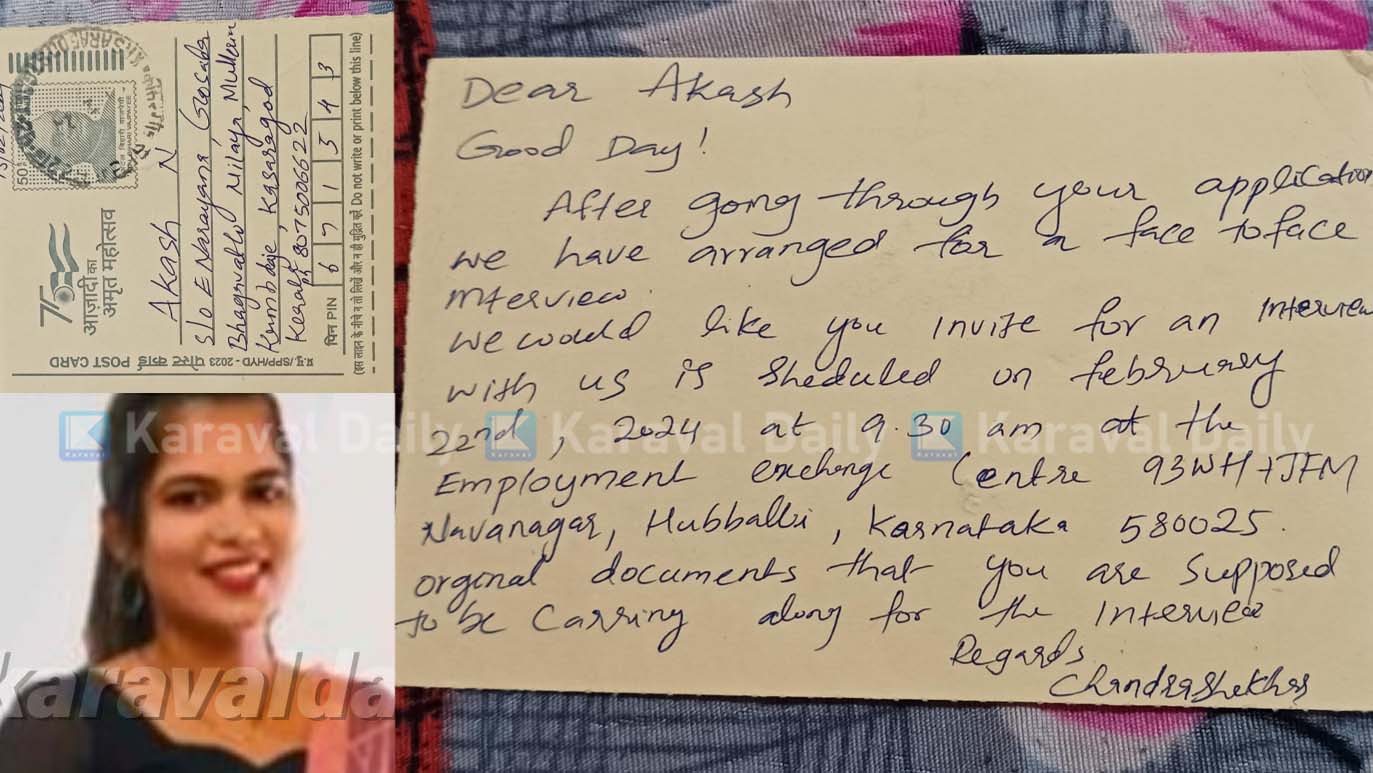സച്ചിത പറഞ്ഞതു പ്രകാരം ദിവസങ്ങള്ക്കകം പോസ്റ്റ് കാര്ഡ് ലഭിച്ചു. 2024 ഫെബ്രുവരി 22ന് ഹുബ്ബള്ളിയില് നടക്കുന്ന ഇന്റര്വ്യൂവില് പങ്കെടുക്കണമെന്നാണ് കാര്ഡില് പറയുന്നത്. എന്നാല് ഇന്റര്വ്യൂ നടക്കുമെന്നു പറഞ്ഞ ദിവസം ഉച്ച കഴിഞ്ഞാണ് ഇന്റര്വ്യു കാര്ഡ് ആകാശിനു ലഭിച്ചത്. ഇതേ കുറിച്ച് പോസ്റ്റോഫീസില് എത്തി അന്വേഷിച്ചപ്പോഴാണ് കാര്ഡ് അയച്ചത് ഹുബ്ബള്ളിയില് നിന്നല്ല കാസര്കോട്ടു നിന്നാണെന്ന കാര്യം പരാതിക്കാരിക്ക് മനസ്സിലായത്. മാത്രമല്ല ഇന്റര്വ്യു നടത്തുന്ന സ്ഥാപനത്തിന്റെ സീല് പോലും കാര്ഡില് ഉണ്ടായിരുന്നില്ല. ഇത് തന്നെ തെറ്റിദ്ധരിപ്പിക്കുന്നതിനാണ് അയച്ചതെന്നാണ് പരാതിക്കാരി ആരോപിക്കുന്നത്.