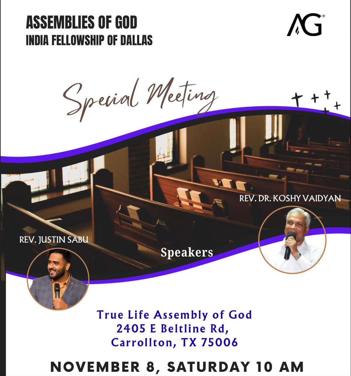 ഡാളസ്: അസംബ്ലീസ് ഓഫ് ഗോഡ് ഇന്ത്യ ഫെലോഷിപ്പ് ഓഫ് ഡാളസിൻ്റെ സ്പെഷ്യൽ മീറ്റിംഗ് 8 നു രാവിലെ കരോൾട്ടൺ ട്രൂ ലൈഫ് അസംബ്ലി ഓഫ് ഗോഡ് സഭാ മന്ദിരത്തിൽ നടക്കുo. പാസ്റ്റർ ജെസ്റ്റിൻ സാബു, ഡോ. കോശി വൈദ്യൻ പ്രഭാഷണം നടത്തും. ആത്മീയ സംഗമത്തിലേക്കു മുഴുവനാളുകളെയും സംഘാടകർ സ്വാഗതം ചെയ്തു.