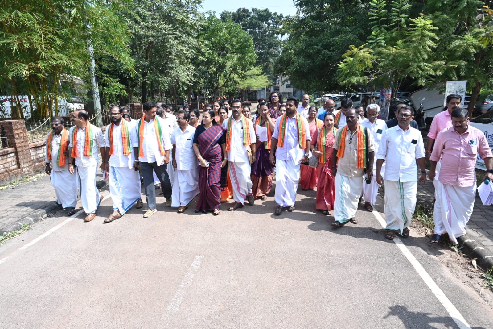 കാസര്കോട്: തദ്ദേശ തെരഞ്ഞെടുപ്പില് കാസര്കോട് ജില്ലാ പഞ്ചായത്തിലേക്ക് മല്സരിക്കുന്ന എന്ഡിഎ സ്ഥാനാര്ത്ഥികള് നാമനിര്ദേശ പത്രിക സമര്പ്പിച്ചു. കളക്ടറേറ്റിന് മുന്നില് പ്രകടനമായി എത്തിയാണ് സ്ഥാനാര്ത്ഥികള് പത്രിക സമര്പ്പിച്ചത്. എം. വിജയകുമാര് റൈ(വോര്ക്കാടി), മണികണ്ഠ പഠ്ള(പുത്തിഗെ), രാമപ്പ കെ.പി(ബദിയടുക്ക), ബേബി ജി(ദേലംപാടി), മനുലാല് എം(കുറ്റിക്കോല്), ധന്യ എം(കള്ളാര്), ടി.ഡി. ഭരതന്(കയ്യൂര്), രമണി കെ എസ്(ചിറ്റാരിക്കല്), ഷീബ ടി(ചെറുവത്തൂര്), എ. വേലായുധന്(മടിക്കൈ), ഹേമലത(പെരിയ), മാലതി(ബേക്കല്), സൗമ്യ എസ്(ഉദുമ), ശുഭലത(ചെങ്കള), സുനില് പി.ആര്(സിവില് സ്റ്റേഷന്), സുനില് കുമാര് ടി.സി(കുമ്പള), ജയന്തി ഷെട്ടി(മഞ്ചേശ്വരം) എന്നിവരാണ് ബിജെപിയെ പ്രതിനിധീകരിച്ച് പത്രിക സമര്പ്പിച്ചത്. ഡിവിഷന് പിലിക്കോടില് നിന്നും ബി.ഡി.ജെ.എസിനെ പ്രതിനിധീകരിച്ച് കുഞ്ഞിക്കൃഷ്ണന് വ്യാഴാഴ്ച പത്രിക സമര്പ്പിച്ചിരുന്നു. നേതാക്കളായ വി. രവീന്ദ്രന്, സതീഷ്ചന്ദ്ര ഭണ്ഡാരി, മേഖലാ പ്രസിഡന്റ് കെ. ശ്രീകാന്ത്, ബിജെപി ജില്ലാ പ്രസിഡന്റ് അശ്വിനി എം.എല്, എന്. ബാബുരാജ്, സുകുമാരന് കാലിക്കടവ്, നാരായണ നായിക്, ഉള്പ്പെടെയുള്ള മുതിര്ന്ന നേതാക്കള് സ്ഥാനാര്ത്ഥികളെ അനുഗമിച്ചു.