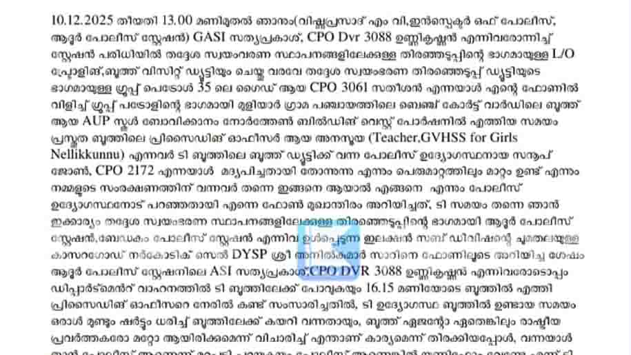കാസര്കോട്: മദ്യലഹരിയില് തെരഞ്ഞെടുപ്പ് ഡ്യൂട്ടിക്കെത്തി വനിതാ പ്രിസൈഡിംഗ് ഓഫീസറോട് മോശമായി പെരുമാറിയ കാഞ്ഞങ്ങാട് ബീറ്റാ കണ്ട്രോള് റൂമിലെ പൊലീസുകാരനെതിരെ ആദൂര് പൊലീസ് കേസെടുത്തു. ആദൂര് പൊലീസ് ഇന്സ്പെക്ടര് എം.വി വിഷ്ണുപ്രസാദിന്റെ പരാതി പ്രകാരമാണ് സിപിഒയായ സനൂപ് ജോണിനെതിരെ കേസെടുത്തത്. മുളിയാര് പഞ്ചായത്തിലെ ബെഞ്ച് കോര്ട്ട് വാര്ഡിലെ ബൂത്തായ ബോവിക്കാനം എ.യു.പി സ്കൂളില് ബുധനാഴ്ച വൈകുന്നേരം നാലരമണിയോടെയാണ് കേസിനാസ്പദമായ സംഭവം. ഇതേ കുറിച്ച് ആദൂര് പൊലീസ് രജിസ്റ്റര് ചെയ്ത കേസില് പറയുന്നത് ഇങ്ങനെ- ‘അധ്യാപികയായ അനസൂയയാണ് ബൂത്തിലെ പ്രിസൈഡിംഗ് ഓഫീസര് പ്രസ്തുത ബൂത്തില് ഡ്യൂട്ടിക്ക് എത്തിയതായിരുന്നു സനൂപ് ജോണ്. മുണ്ടും ഷര്ട്ടും ധരിച്ചാണ് ഇയാള് ബൂത്തിലെത്തിയത്. പ്രിസൈഡിംഗ് ഓഫീസര് ചോദ്യം ചെയ്തപ്പോള് പൊലീസ് ആണെന്നായിരുന്നു മറുപടി. പൊലീസാണെങ്കില് യൂണിഫോം വേണ്ടെയെന്നു ചോദിച്ചു. നിങ്ങള് എന്താ സാരിയുടുക്കാത്തതെന്നു പൊലീസുകാരന് തിരിച്ചു ചോദിച്ചു. ഈ വിവരം സ്ഥലത്ത് ഉണ്ടായിരുന്ന പൊലീസുകാരന് ഇലക്ഷന് സബ്ഡിവിഷന്റെ ചുമതലയുള്ള നാര്ക്കോട്ടിക് സെല് ഡിവൈ.എസ്.പി അനില് കുമാറിനെ ഫോണിലൂടെ അറിയിച്ചു. തുടര്ന്ന് ഇന്സ്പെക്ടര് എം.വി വിഷ്ണുപ്രസാദും സംഘവും ബൂത്തിലെത്തി. പ്രിസൈഡിംഗ് ഓഫീസറോട് സംഭവത്തെകുറിച്ച് വിശദമായി ചോദിച്ചറിഞ്ഞു. പൊലീസുകാരന് എന്നു പറഞ്ഞയാള് അകത്തു കിടക്കുന്നുണ്ടെന്നായിരുന്നു പ്രിസൈഡിംഗ് ഓഫീസര് പറഞ്ഞത്. തുടര്ന്ന് എ.എസ്.ഐ സത്യപ്രകാശന് പൊലീസുകാരനെ ബൂത്തിനു പുറത്തേക്ക് കൂട്ടിക്കൊണ്ടു വന്നു. മദ്യപിച്ചിട്ടുണ്ടോയെന്ന ചോദ്യത്തിന് ഞാന് ഇന്നു മദ്യപിച്ചിട്ടില്ല എന്നും ഇന്നലെ മദ്യപിച്ചിരുന്നുവെന്നും മറുപടി നല്കി. എന്നാല് സംസാരത്തില് മദ്യ ലഹരിയിലാണെന്നു വ്യക്തമായതോടെ മെഡിക്കല് ടെസ്റ്റ് നടത്താമെന്നു പറഞ്ഞു. യൂണിഫോം ഇട്ട് വരാമെന്നു പറഞ്ഞ് റസ്റ്റ് റൂമിലേക്ക് പോയ പൊലീസുകാരന് ബാഗുമായി പുറത്തിറങ്ങി ഓടി. ബൂത്തിനു പുറത്തു പാര്ക്ക് ചെയ്തിരുന്ന കാറുമായി അമിത വേഗതയില് രക്ഷപ്പെടുകയായിരുന്നു. സ്ഥലത്ത് ഉണ്ടായിരുന്ന പൊലീസുകാരനെ തട്ടിത്തെറുപ്പിച്ചാണ് സനൂപ് ജോണ് സ്ഥലം വിട്ടത്.’ ബൂത്തില് മദ്യപിച്ചെത്തുകയും നാടകീയ രംഗങ്ങള് സൃഷ്ടിക്കുകയും ചെയ്ത പൊലീസുകാരനെതിരെ കര്ശന നടപടി ഉണ്ടാകുമെന്നാണ് സൂചന.