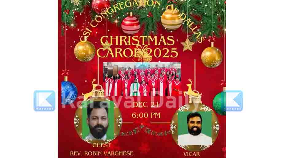 ഡാളസ്: സി.എസ്.ഐ കോൺഗ്രിഗേഷൻ ഓഫ് ഡാളസിന്റെ ക്രിസ്മസ് കരോൾ 21 ഞായറാഴ്ച വൈകിട്ടു ആഘോഷിക്കും. ശുശ്രൂഷയിൽ വൈവിധ്യമാർന്ന കരോൾ ഗാനങ്ങളും ക്രിസ്മസ് സന്ദേശവും ഉണ്ടായിരിക്കും.