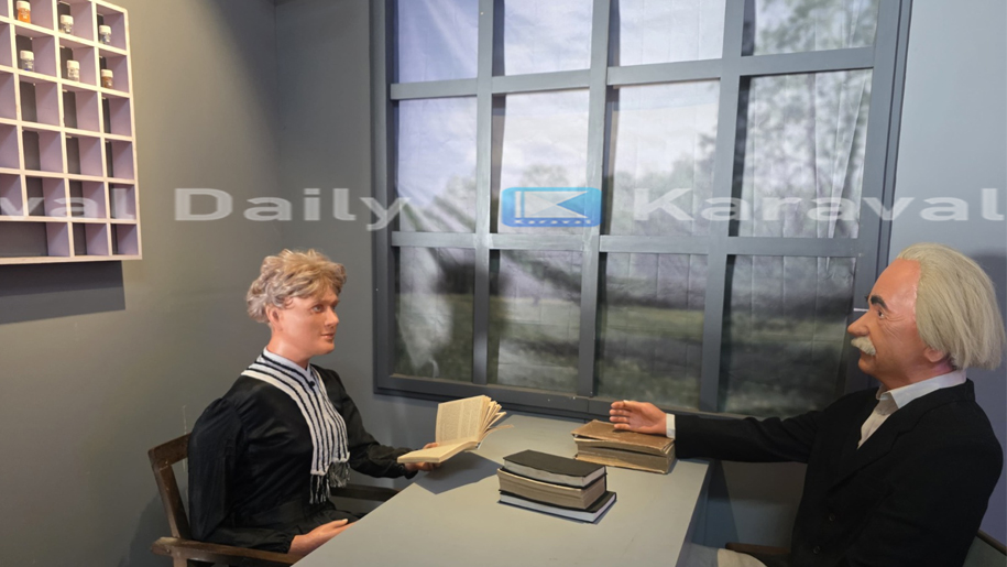 റേഡിയോ ആക്റ്റിവിറ്റി സംബന്ധിച്ച ഗവേഷണത്തിലൂടെ ക്വാണ്ടം ഫിസിക്സിൻ്റെ വളർച്ചയിൽ പ്രശസ്തയായ മേരി ക്യൂറിയും ഒന്നിച്ചിരിക്കുന്ന ശില്പം ജീവൻ തുടിക്കുന്നവയാണ്. ഭൗതികശാസ്ത്രത്തിനും രസതന്ത്രത്തിനും നോബൽ സമ്മാനം ലഭിച്ചിട്ടുള്ള ആദ്യ വനിത യാണ് മാഡം ക്യൂറി എന്ന മേരി ക്യൂറി . കോഴിക്കോട് പ്ലാനിറ്റോറിയത്തിൽ ജോലി ചെയ്യുന്ന ജസ്റ്റിൻ ജോസഫ് കണ്ണൂർ ഇരട്ടിക്കടുത്ത എടൂർ സ്വദേശിയാണ്.