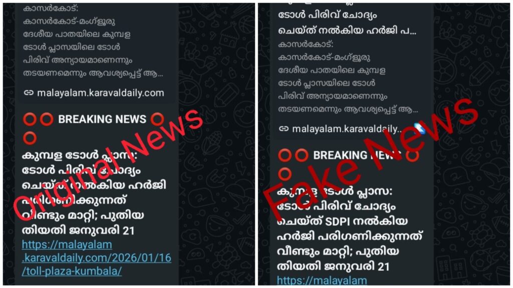 കാസർകോട് : കുമ്പള ടോൾ പ്ലാസയിലെ ടോൾ പിരിവിനെതിരെ ആക്ഷൻ കമ്മറ്റി ഹൈക്കോടതിയിൽ സമർപ്പിച്ച ഹർജി ജനുവരി 21ന് വീണ്ടും പരിഗണിക്കുമെന്ന വാർത്തയുടെ ലിങ്കിൽ നുഴഞ്ഞുകയറി വ്യാജ വിവരങ്ങൾ ചേർത്ത് തട്ടിപ്പ്. ആക്ഷൻ കമ്മറ്റി നൽകിയ ഹർജിയിൽ എസ് ഡി പി ഐ എന്നു തെറ്റായി എഡിറ്റ് ചെയ്താണ് കൃത്രിമം കാണിച്ചത്. സൈബർ തട്ടിപ്പു കാണിച്ചവർക്കെതിരെ നിയമനടപടി സ്വീകരിക്കുമെന്ന് കാരവൽ മീഡിയ മുന്നറിയിപ്പു നൽകി. തട്ടിപ്പുസംഘങ്ങൾക്കെതിരെ വായനക്കാർ ജാഗ്രത കാണിക്കണമെന്നും കള്ള പ്രചരണങ്ങളിൽ വിശ്വസിക്കരുതെന്നും അറിയിച്ചു.