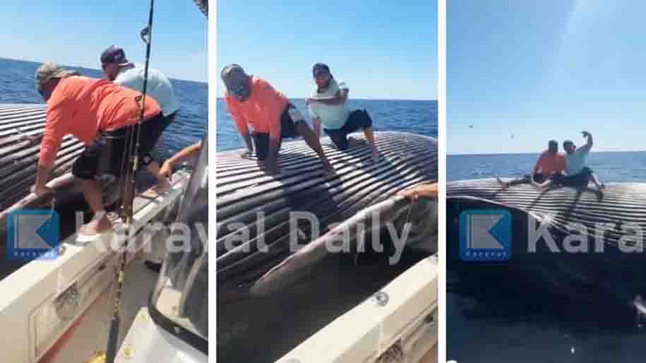 വൈറല് വീഡിയോയില് സമുദ്രത്തില് ചത്ത് ഒഴുകി നടക്കുന്ന ഒരു കൂറ്റന് തിമിംഗലത്തിന്റെ പുറത്തേക്ക് കയറാന് ശ്രമിക്കുന്ന രണ്ട് മത്സ്യ തൊഴിലാളികളെ കാണാം. ബോട്ടില് മത്സ്യ ബന്ധനത്തിനായി പോകുന്നതിനിടെയാണ് തിമിംഗലത്തെ ഇവര് കാണുന്നത്. ബോട്ട് തിമിംഗലത്തിനടുത്തേക്ക് അടുപ്പിക്കുകയും രണ്ട് പേര് അതിന് മുകളിലേക്ക് കയറുകയും ചെയ്യുന്നത് വീഡിയോയില് ഉണ്ട്.