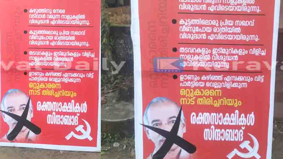 ” കഴുത്തിനു നേരെ വടിവാള് വരുന്ന നാളുകളില് വിശുദ്ധന് എവിടെയായിരുന്നു? കൂട്ടത്തിലൊരു പ്രിയ സഖാവ് വീണു പോയ രാത്രിയില് വിശുദ്ധന് എവിടെയായിരുന്നു? തടവറകളും ഇടി മുറികളും വിളിച്ച നാളുകളില് വിശുദ്ധന് എവിടെയായിരുന്നു?, ഊണും കഴിഞ്ഞ് ഏമ്പക്കവും വിട്ട് പാര്ട്ടിയെ വെല്ലുവിളിക്കുന്ന ഒറ്റുകാരനെ നാട് തിരിച്ചറിയും, രക്തസാക്ഷികള് സിന്ദാബാദ് ” എന്നാണ് കുഞ്ഞികൃഷ്ണന്റെ ചിത്രം വച്ചുകൊണ്ടുള്ള ബോര്ഡില് പറയുന്നത്.
