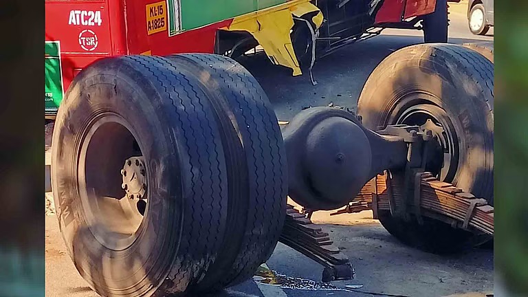 ആക്സിലും ടയറും ഊരിത്തെറിച്ച് നിന്ന ബസില് പിന്നാലെ വന്ന കാറും ഗുഡ്സ് ഓട്ടോറിക്ഷയും ഇടിക്കുകയായിരുന്നു. അപകടത്തില് കാറും ഗുഡ്സ് ഓട്ടോറിക്ഷയും ബസിന്റെ പിന്ഭാഗവും ഭാഗികമായി തകര്ന്നു. അരമണിക്കൂറോളം മേഖലയില് ഗതാഗതം തടസ്സപ്പെട്ടു.