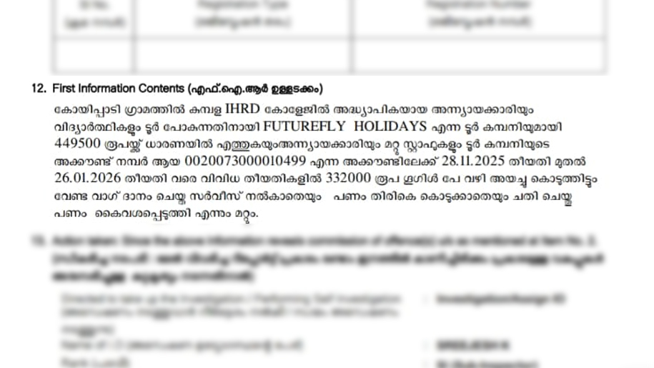 ധാരണ പ്രകാരം 2025 നവംബര് 28 മുതല് 2026 ജനുവരി 26 വരെയുള്ള തീയതികളിലായി ടൂര് കമ്പനിയുടെ അക്കൗണ്ടിലേയ്ക്ക് 3,32,000 രൂപ ഗൂഗിള് പേ വഴി അയച്ചുകൊടുത്തു. എന്നിട്ടും വാഗ്ദാനം ചെയ്ത സര്വീസ് നല്കുകയോ പണം തിരികെ നല്കുകയോ ചെയ്തില്ലെന്ന് പരാതിയില് കൂട്ടിച്ചേര്ത്തു.
