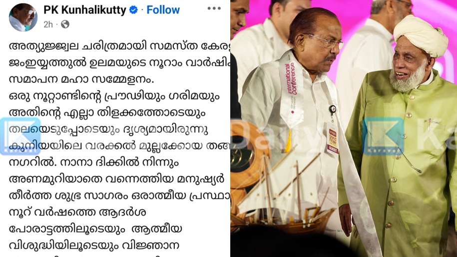 ”സമസ്ത അതിന്റെ പ്രയാണം തലമുറകള്ക്ക് വെളിച്ചം പകര്ന്ന് കൂടുതല് തിളക്കത്തോടെ തുടരട്ടെ, ഒന്നായി ചേര്ന്ന് ഒരുമയോടെ ഐക്യത്തോടെ ഒരുത്തമ സമൂഹത്തിന്റെ അഭിമാനവും അന്തസും കൈമോശം വരാതെ ഈ സത്യപാതയില് നമുക്കും അണി ചേരാം” എന്നു പറഞ്ഞു കൊണ്ടാണ് കുഞ്ഞാലിക്കുട്ടി പോസ്റ്റ് അവസാനിപ്പിക്കുന്നത്.