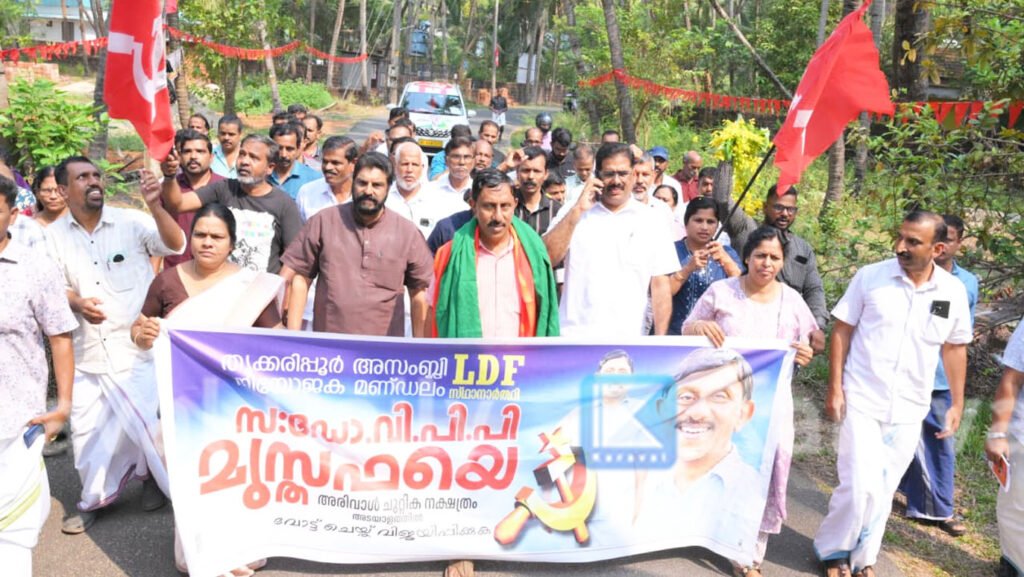 തൃക്കരിപ്പൂര് മണ്ഡലത്തിലെ ഇടതു മുന്നണി സ്ഥാനാര്ത്ഥി വി പി പി മുസ്തഫയുടെ ബുധാഴ്ചത്തെ പര്യടനപരിപാടി സി പി എം ജില്ലാ സെക്രട്ടറി എം രാജഗോപാലന് അഴീത്തലയില് ഉദ്ഘാടനം ചെയ്തു. രാത്രി കയ്യൂര് ചെറിയാക്കരയില് സമാപിക്കും. യു ഡി എഫ് സ്ഥാനാര്ത്ഥി സന്ദീപ് വാര്യരും എന് ഡി എ സ്ഥാനാര്ത്ഥി രവി കുളങ്ങരയും മണ്ഡലത്തില് സജീവമാണ്.