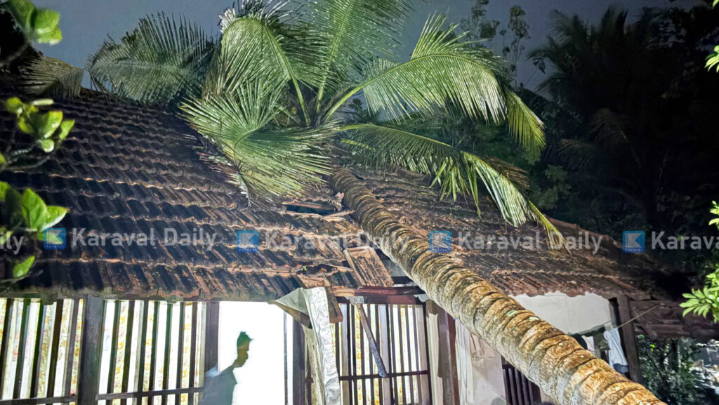 കുമ്പള, മാവിനക്കട്ടയില് തെങ്ങ് കടപുഴകി വീടിനു മുകളിലേക്ക് വീണു. രമേശന്റെ വീടിനു മുകളിലേക്കാണ് തെങ്ങ് വീണത്. വീടിനു ഭാഗികമായി നാശം ഉണ്ടായി.