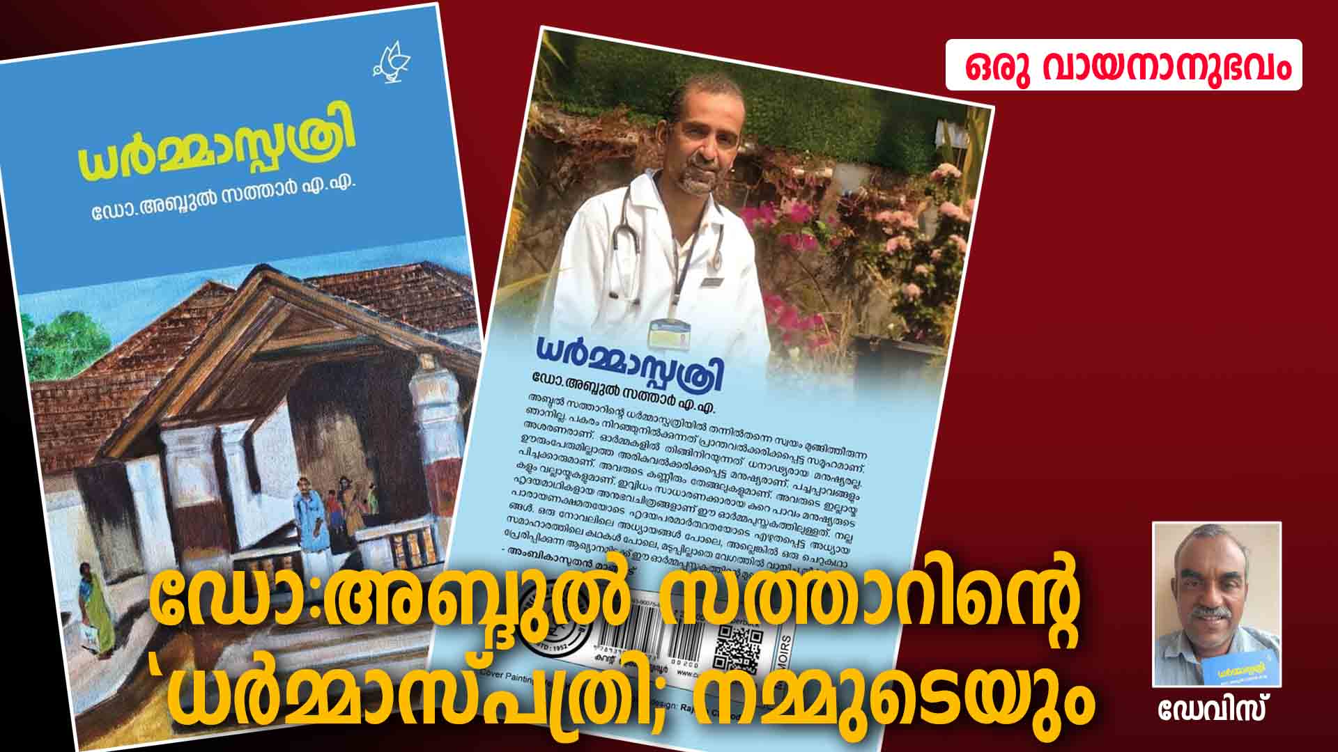 ഡേവിസ് ഡോ.അബ്ദുല് സത്താറിന്റെ ധര്മാസ്പത്രി എന്ന പുതിയ പുസ്തകം ജന സമക്ഷം എത്തിയിരിക്കയാണ്.മുമ്പുള്ള കൃതികളേക്കാള് കൗതുകവും ആകാംഷകളും അവേശവും ആശ്വാസവും വിനോദവും ഇതു വായനക്കാരില് ഉളവാക്കുന്നു എന്നതില് തര്ക്കമില്ല..ഭാഷയില് പോലും കാസര്കോടിന്റെ തനത് മുദ്ര